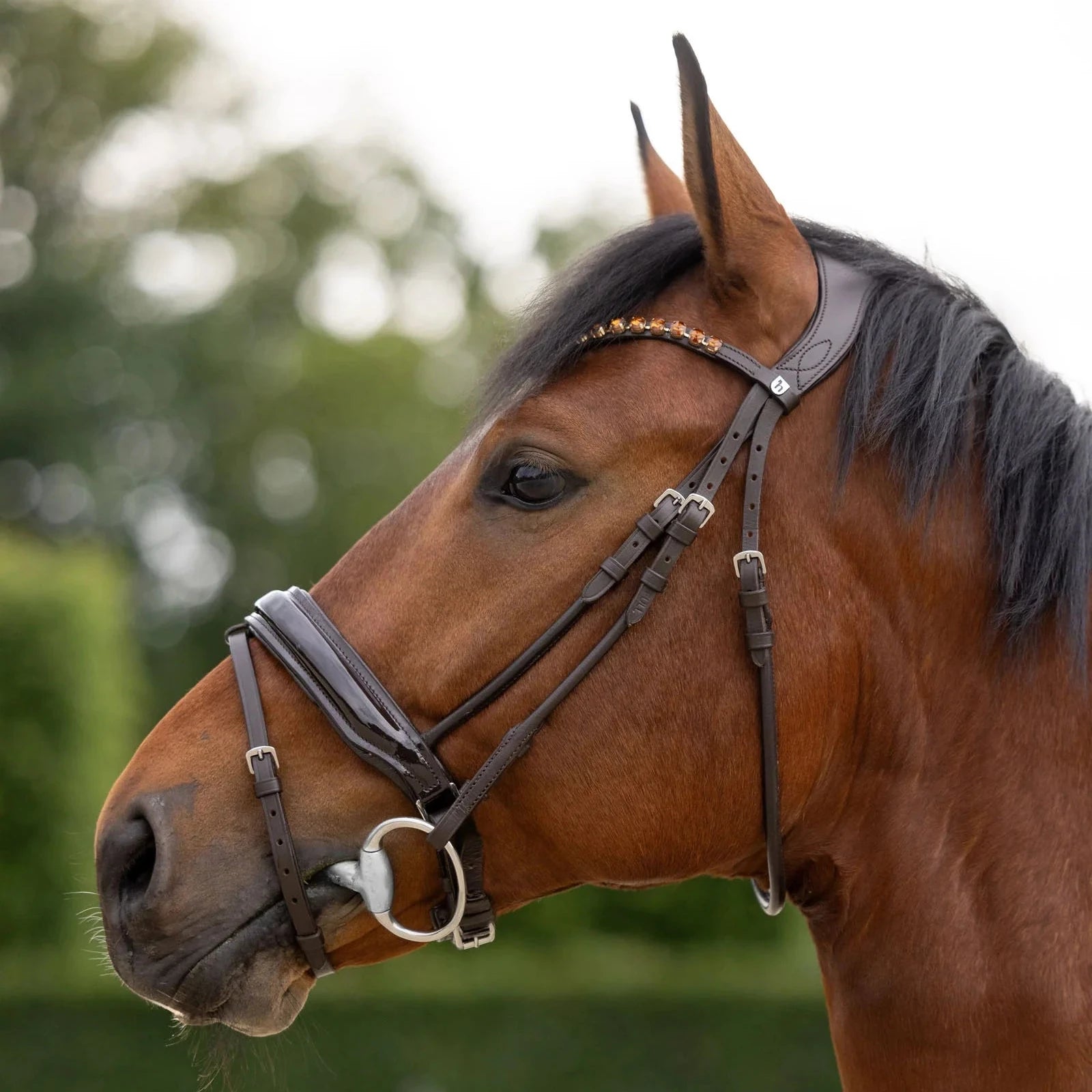 La Cabezada Horze Clermont en marrón hecha de cuero de alta calidad, presenta una frontalera elegante con cristales en forma de "U" que realzan la cabeza de tu caballo.